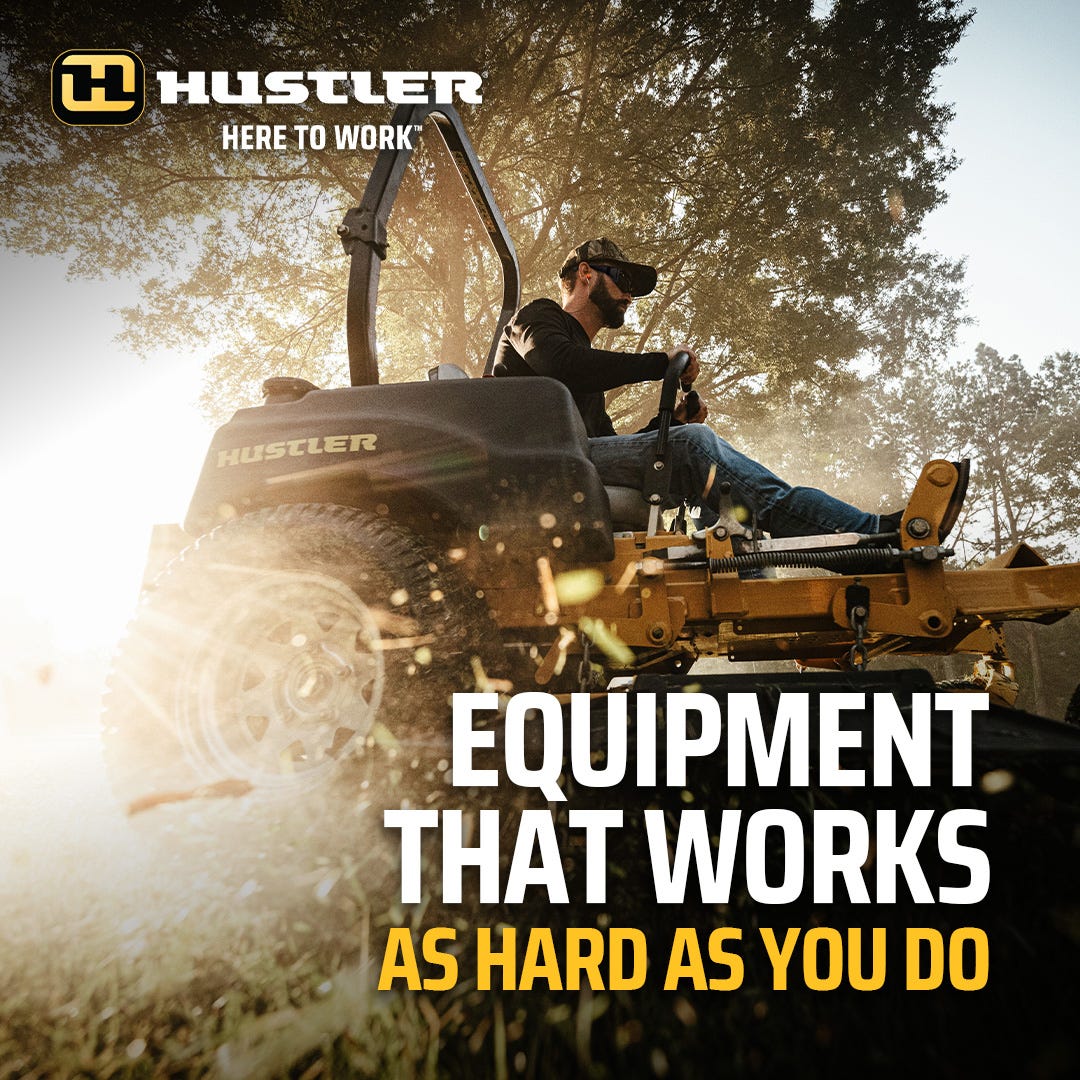 Its background features a landscaper operating a ride mower with two lines of copy:
