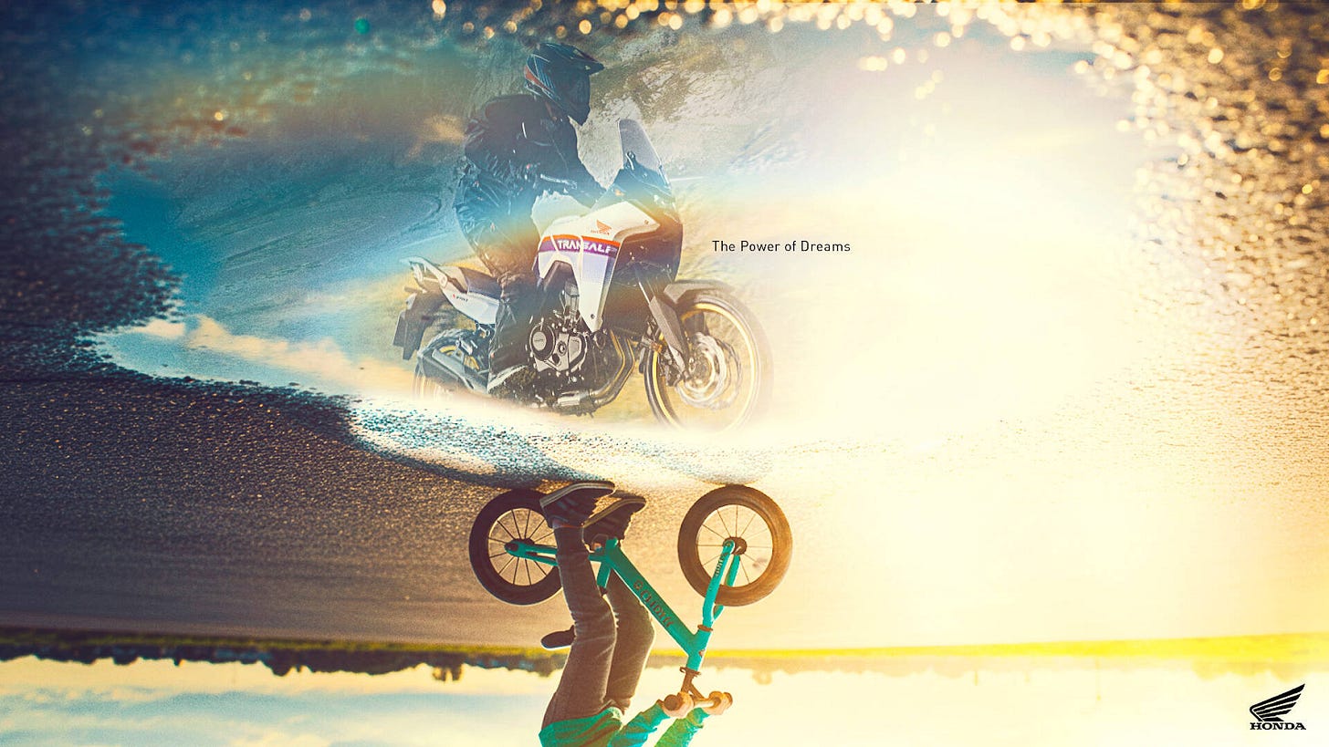 In their ad, the top half shows a grown motorcyclist and flipped underneath features a child pedaling a bicycle.