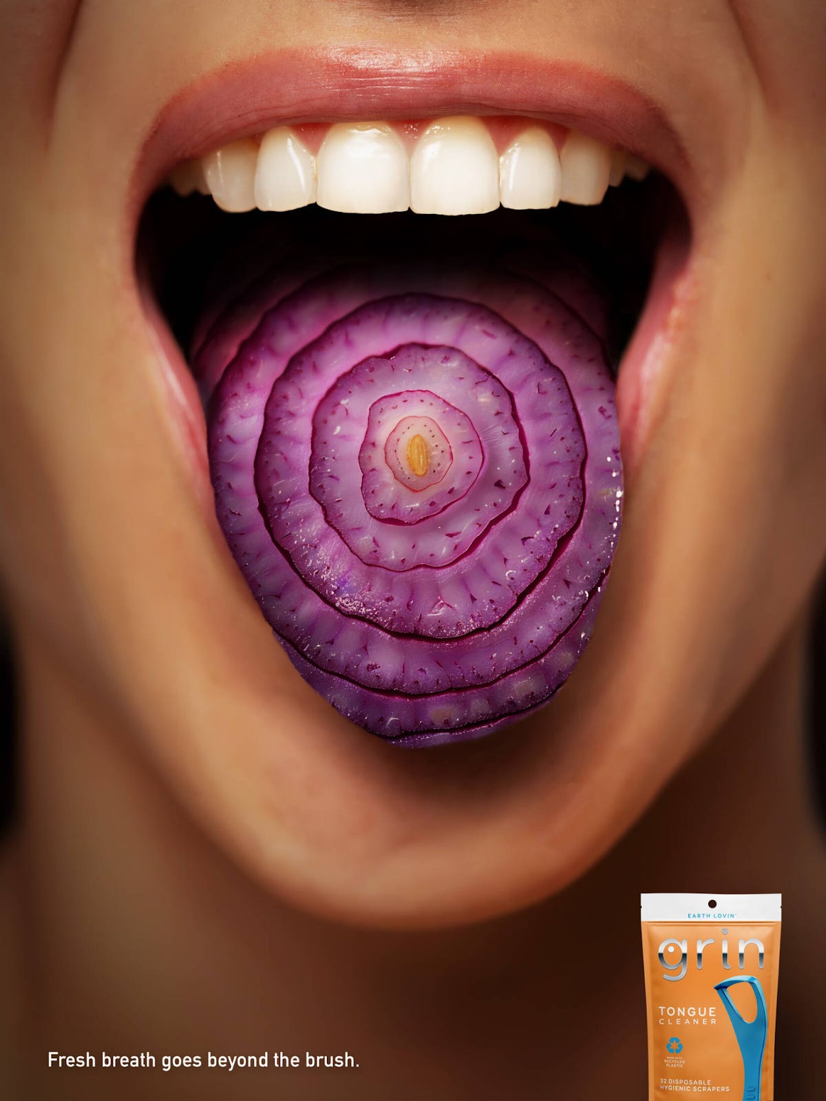The hideous onion makes it impossible to ignore, and cheekily slots in Grin’s tongue scraper as the obvious solution.